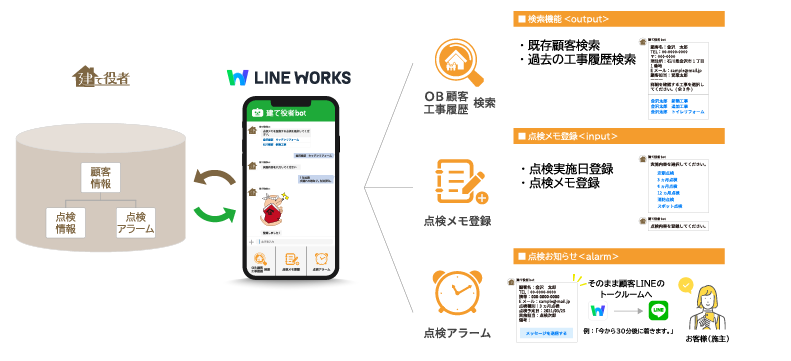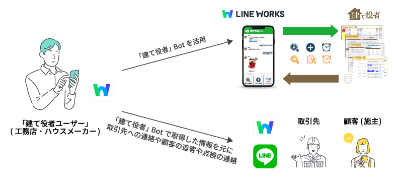 「建て役者」では、「LINE WORKS」と連携した「点検bot」オプションを提供しています。この「点検bot」を利用することで、点検情報の閲覧や登録が「LINE WORKS」から手軽に行えるようになります。